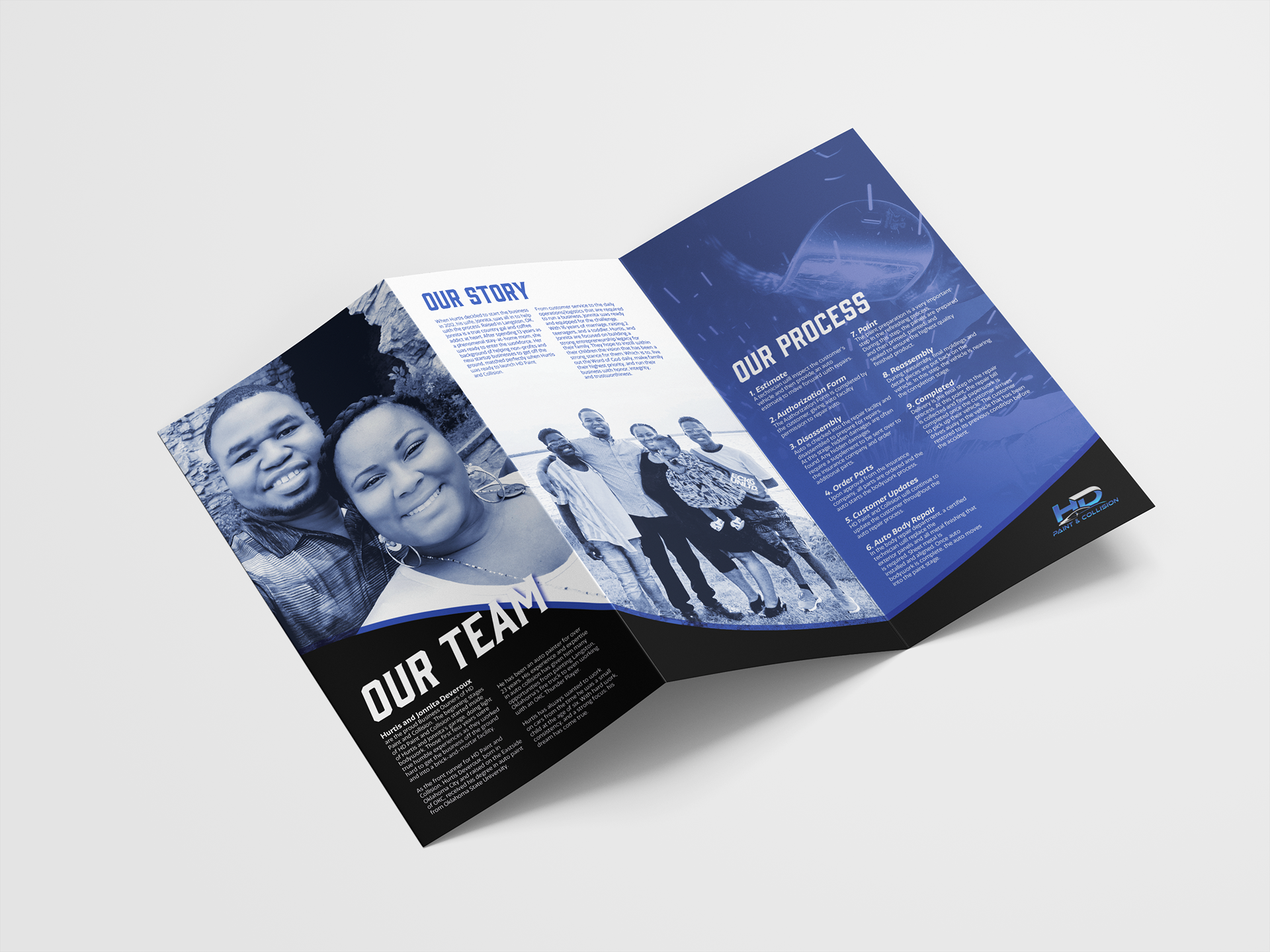 A brochure that breaks down the end to end process of HD Paint and Collision, a local auto body shop in OKC