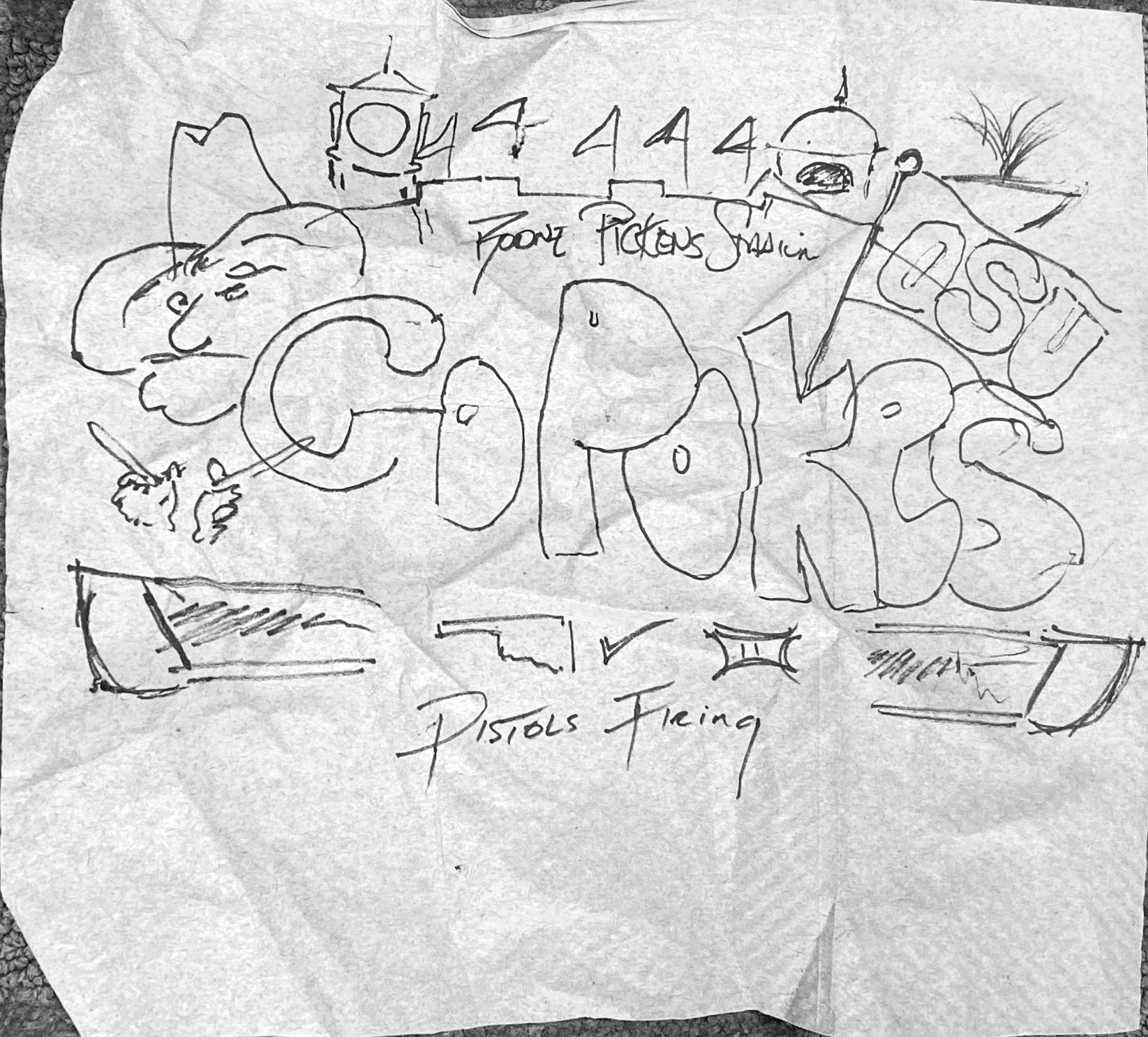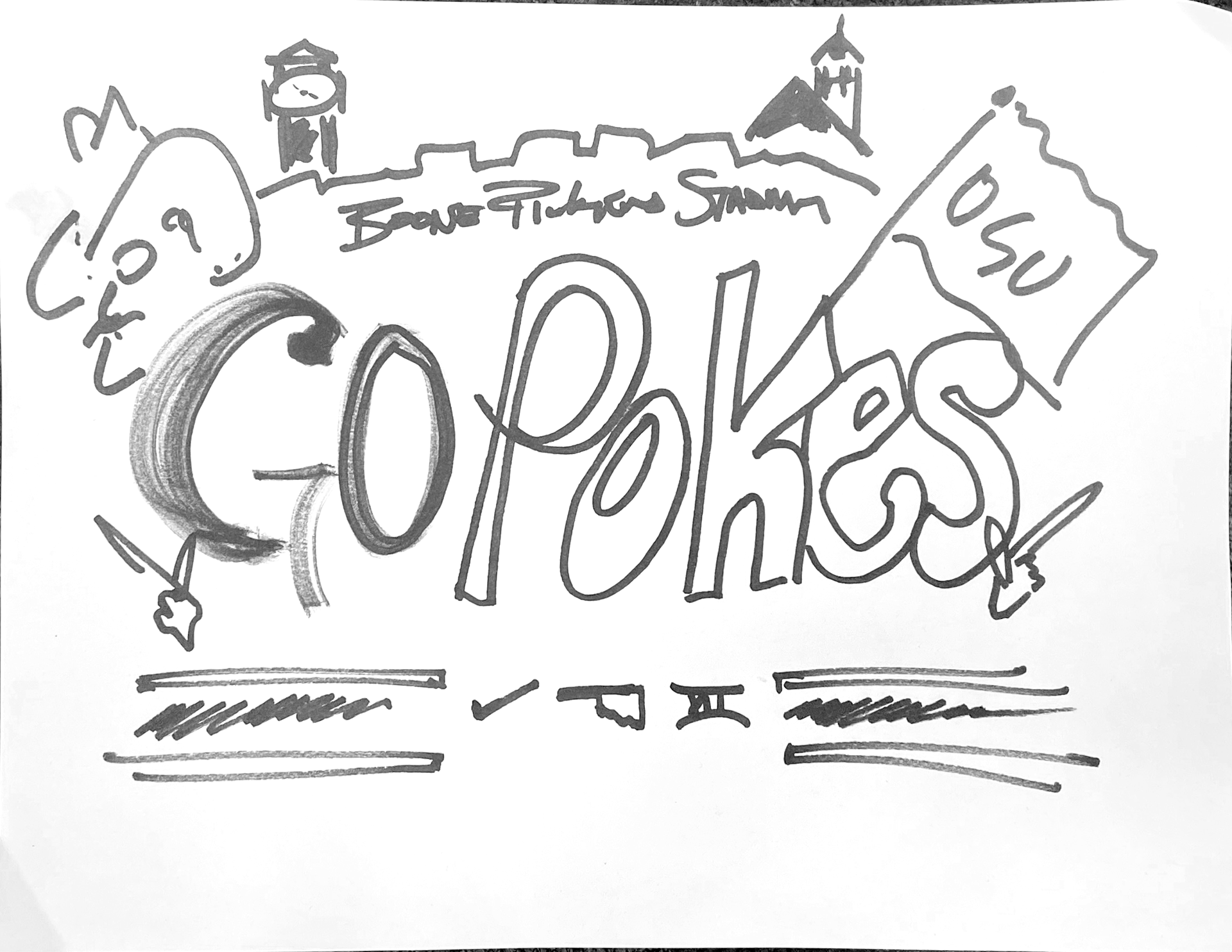 An Extremely fun project for OSU Football recruiting. What an awesome collaboration with the OSU Football recruiting staff, Chris Deal, and Tulsa-based graffiti and tattoo artist Logan Rogers. Chris Deal did the napkin sketch, I did the designing, Logan Rogers did the painting and art. Teamwork makes the job more fun!